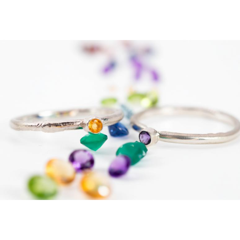 There will be two options: Option one: two rings made of silver wire set with a small faceted stone, Option two: Thicker Silver wire/band set with either a Cabochon (rounded) stone or a faceted (cut sparkly) stone. Students will select their stones and options prior to class. Info regarding this will be emailed to students upon receipt of payment.