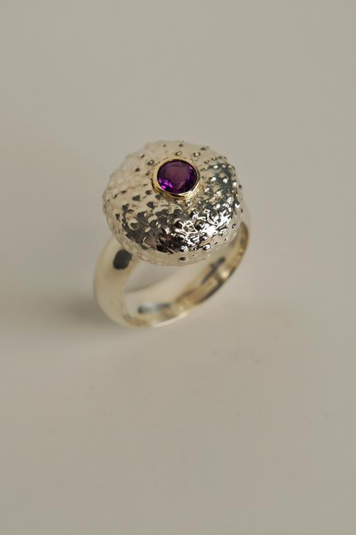 The urchin on this ring was cast from an urchin shell I found in my Grandmothers Jewellery box, after she passed. She would of collected it while visiting Pueto Rico back in the 1950's so it has huge sentimental value to me. I believe all Jewellery should ideally be personally meaningful to the wearer. Set with a beautiful amethyst in a 18k Gold Tube Bezel.