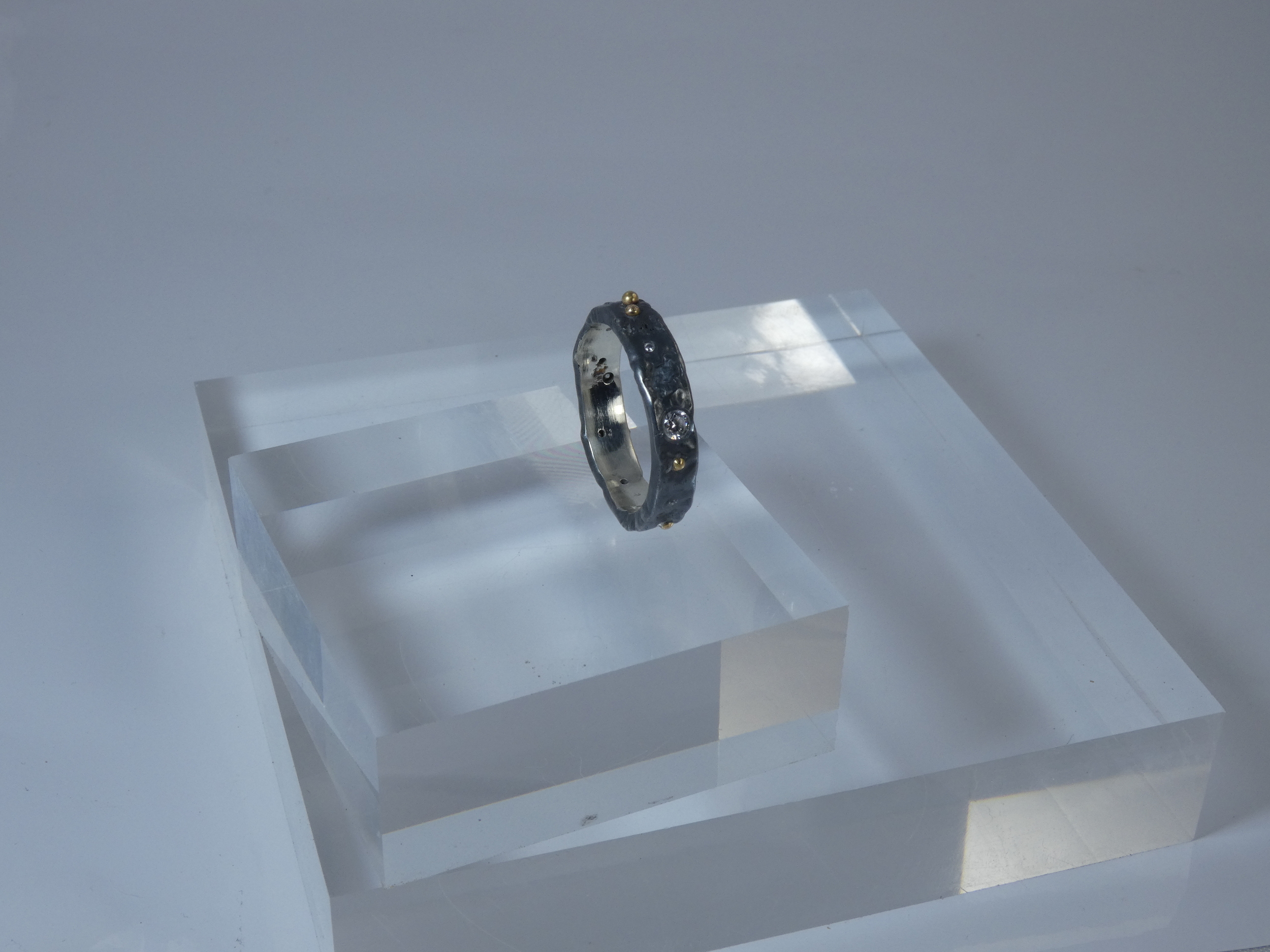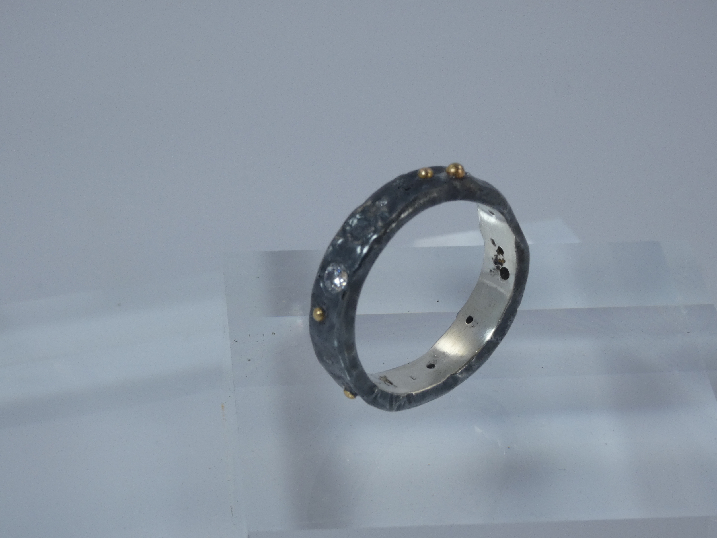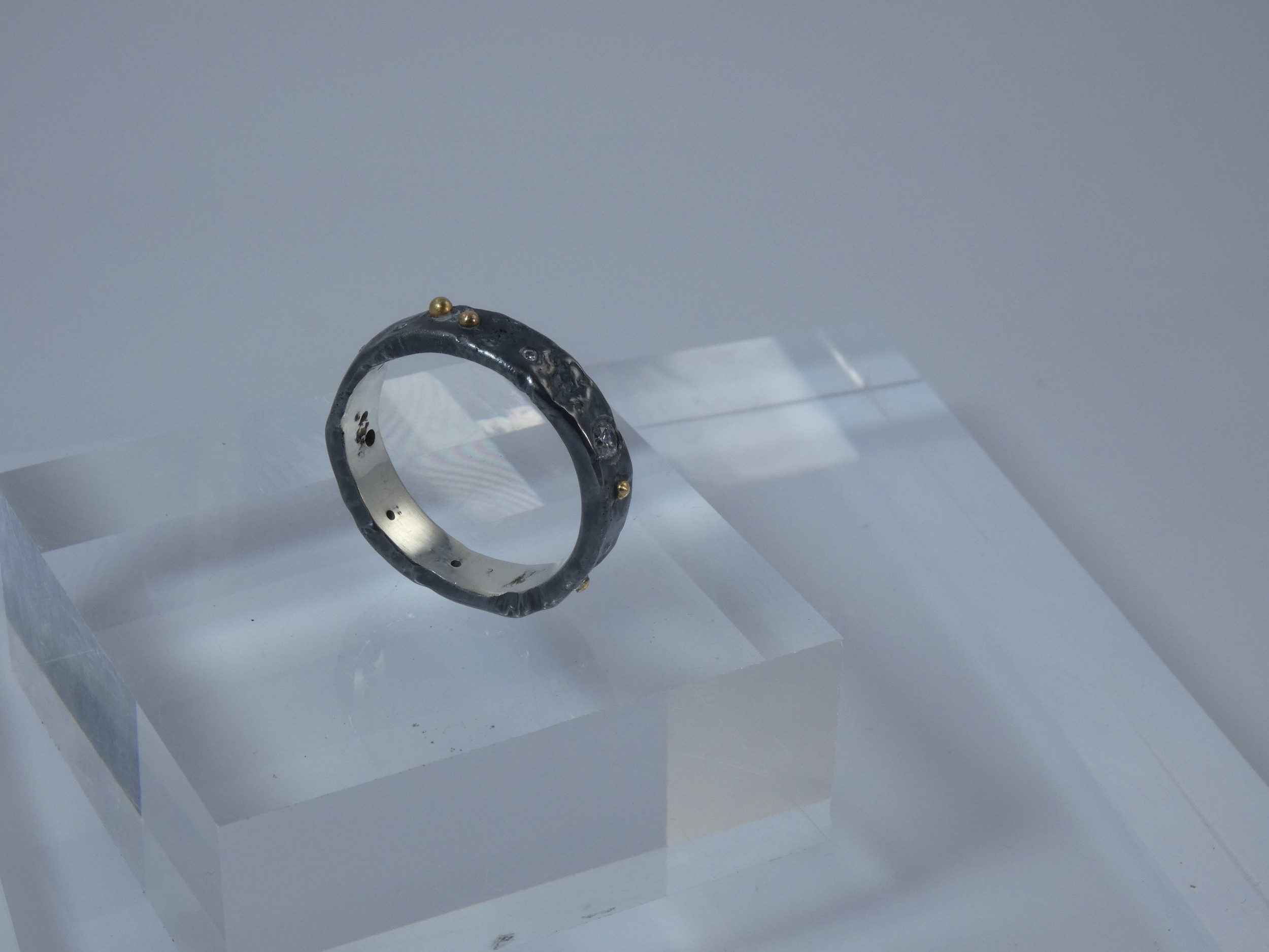 The ring is made with Recycled Sterling Silver which has been reticulated and (once formed) and set with Cubric Zirconia and granulated with 18K Gold.