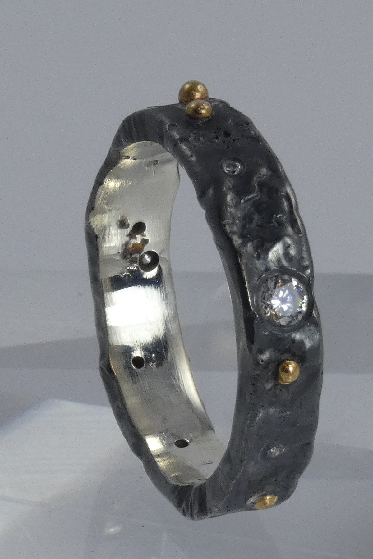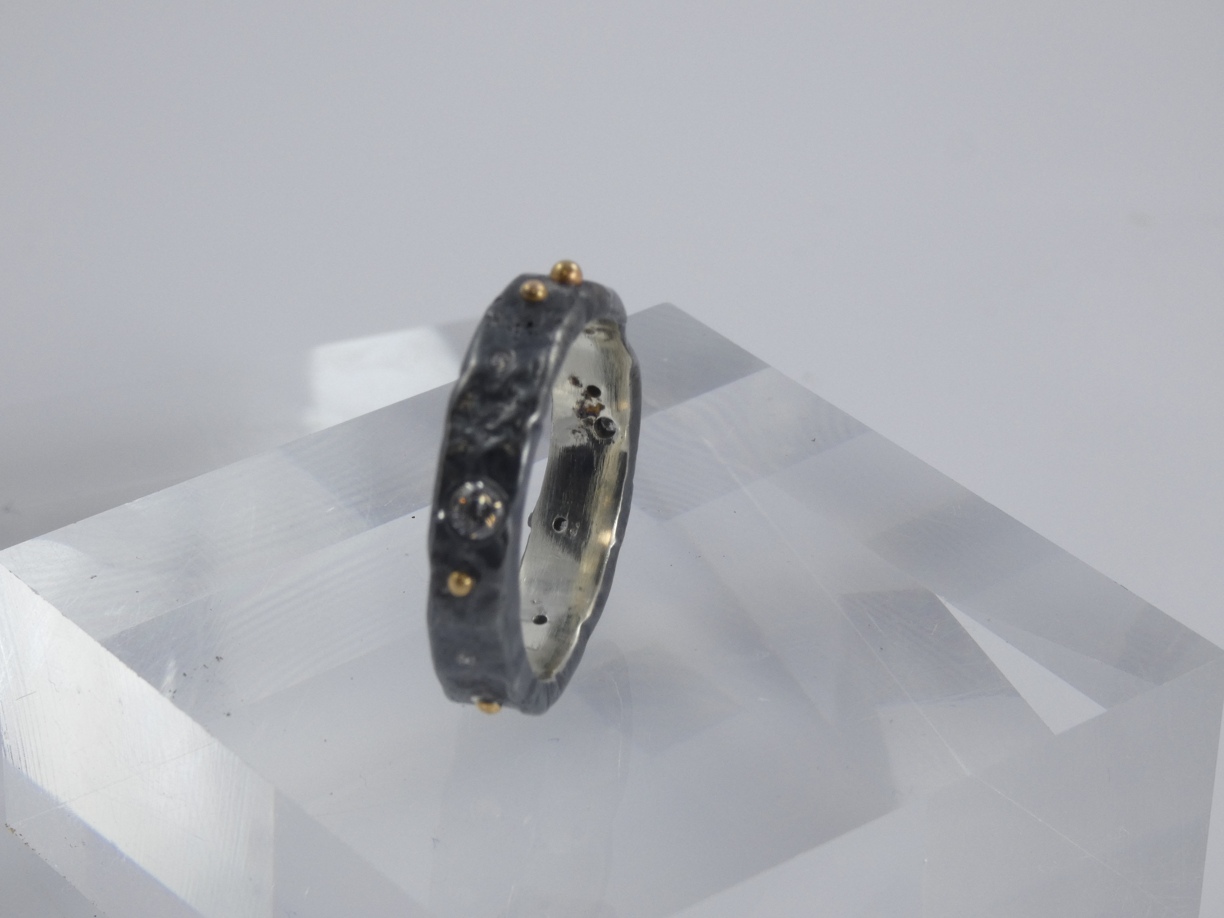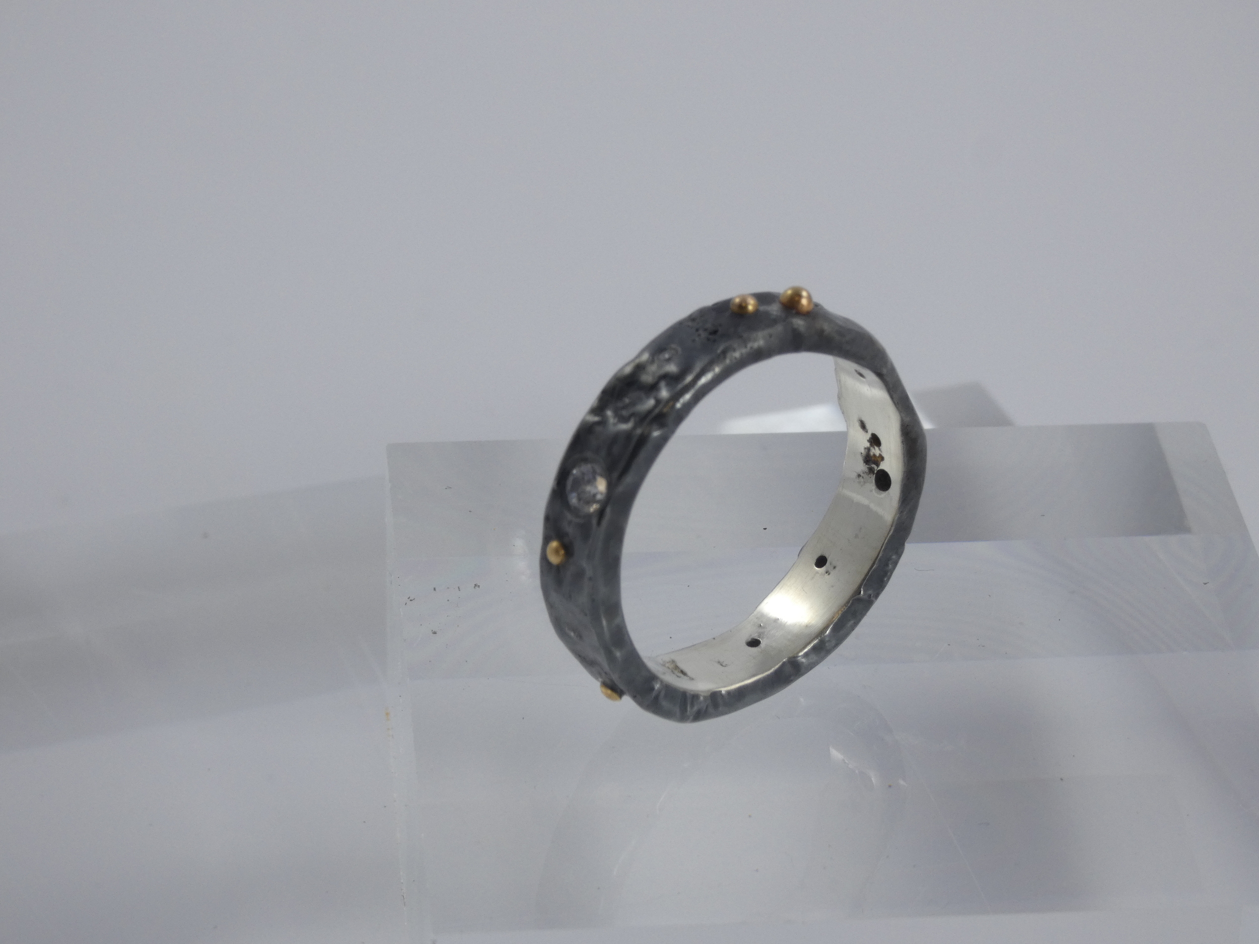 The ring is made with Recycled Sterling Silver which has been reticulated and (once formed) and set with Cubric Zirconia and granulated with 18K Gold.