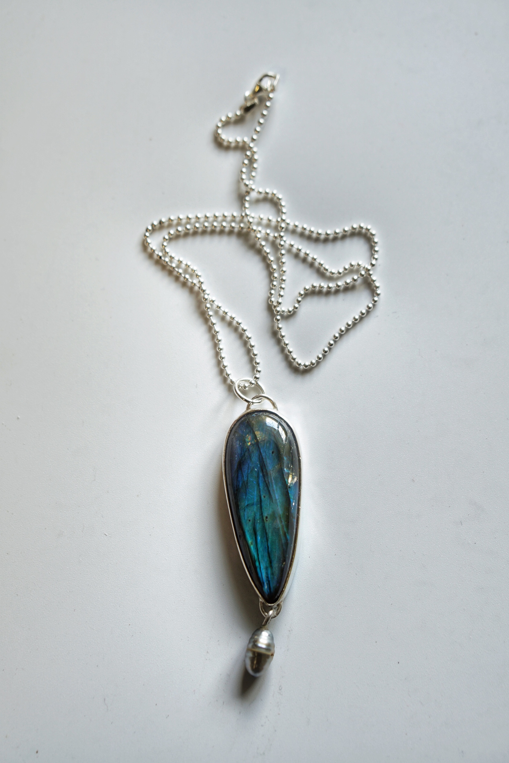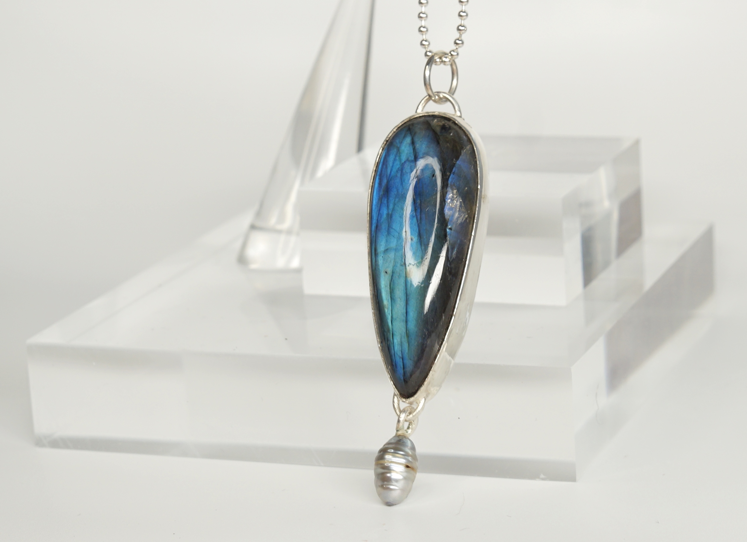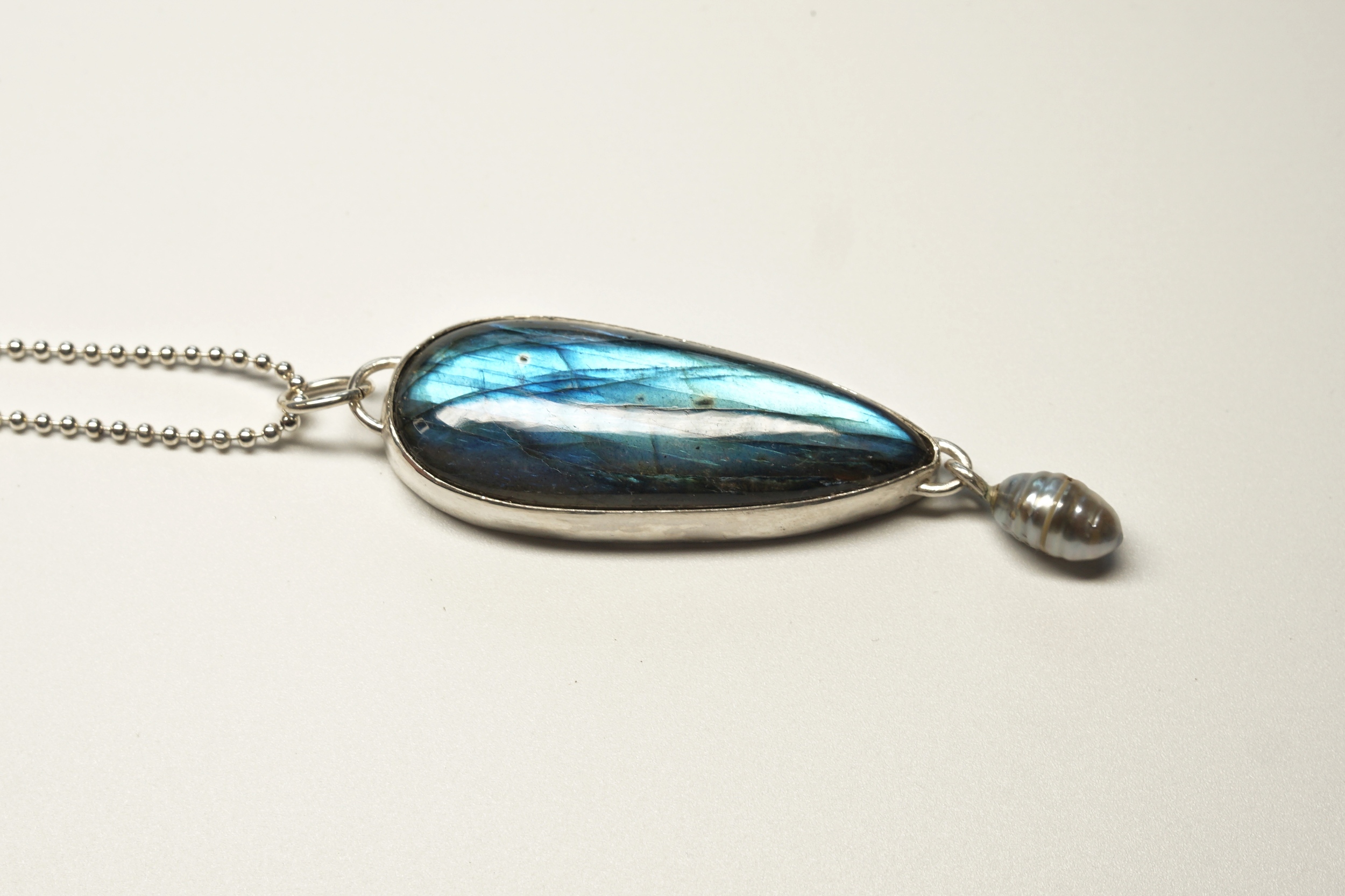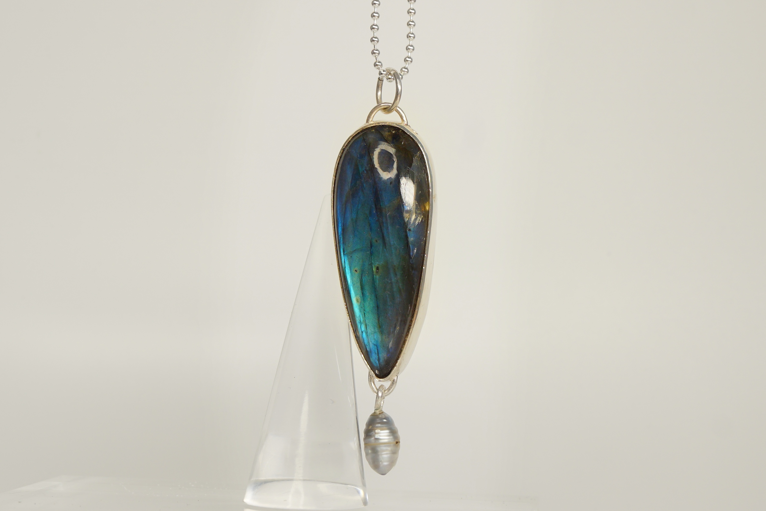 Stunning Labourite stone set in fine silver which has been roll Printed. with Dangly Baroque Pearl from Rarotonga (South Pacific), which I won while travelling there in an underwater pearl dive competition/game.